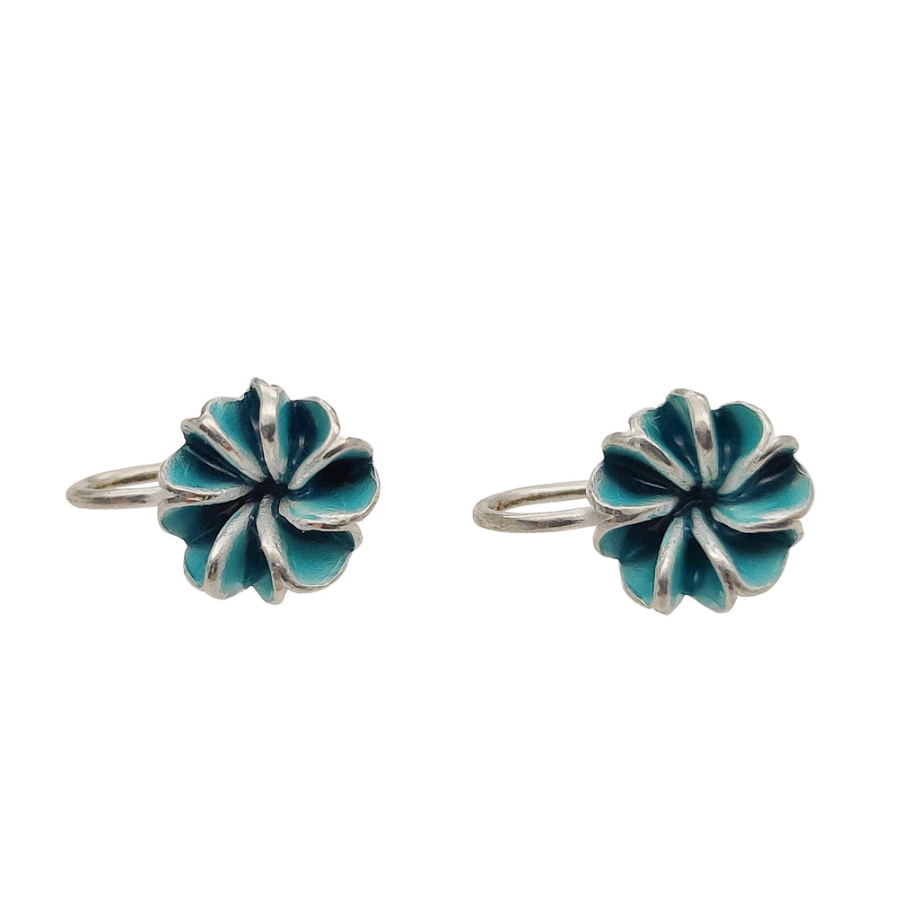 Türkisblau emaillierte runde Blütenohrhänger aus Silber