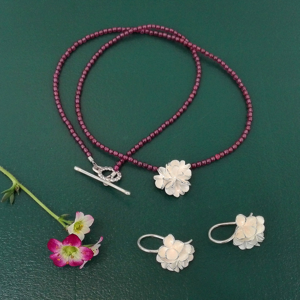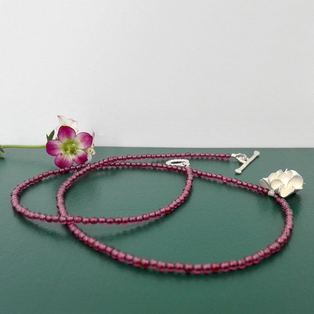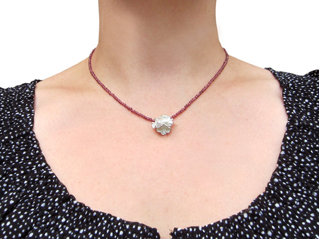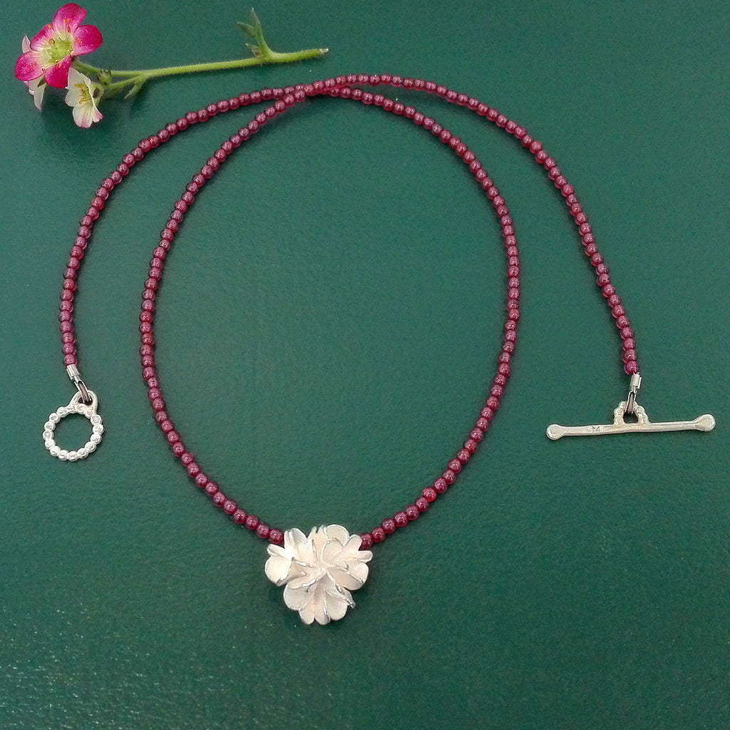 Necklace with a silver flower on a delicate garnet pearl chain