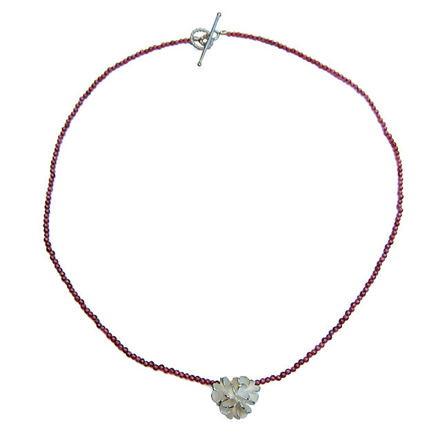 A beautiful pendant in the shape of a silver flower on a delicate garnet pearl necklace with a pearl wire toggle clasp - elegant and romantic.