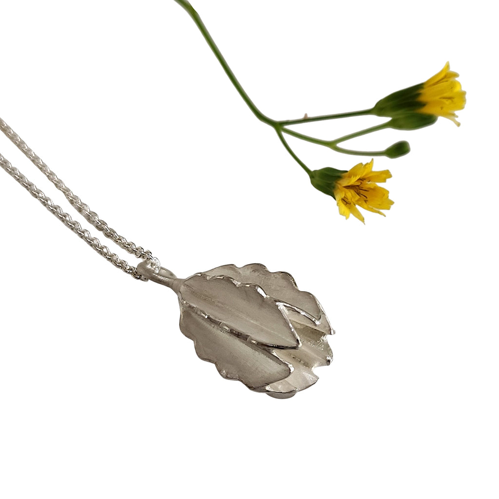 Beautiful silver pendant in the shape of a seed pod including a delicate silver anchor chain.