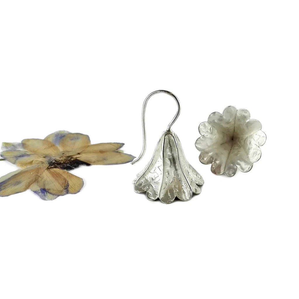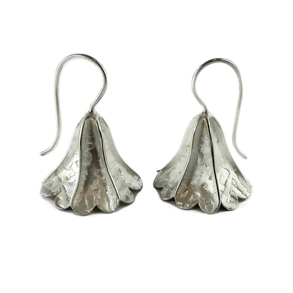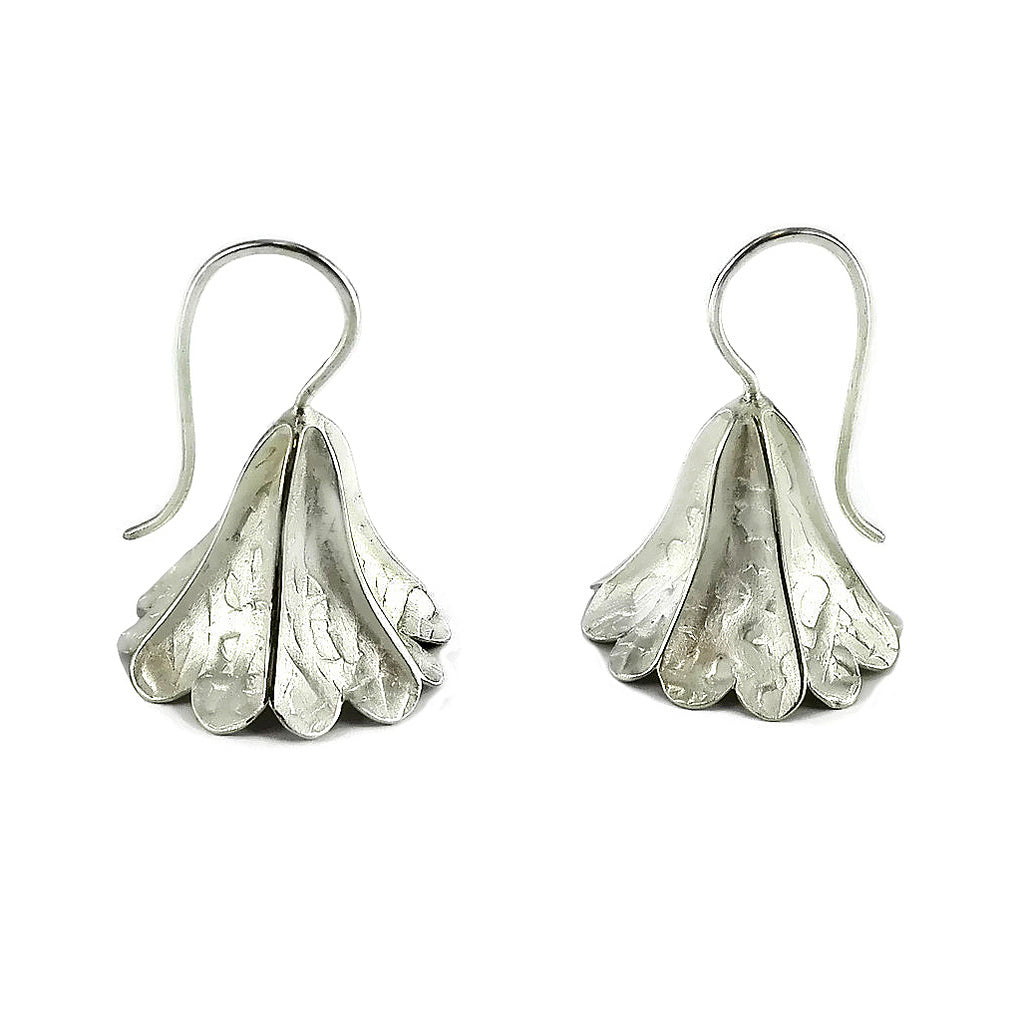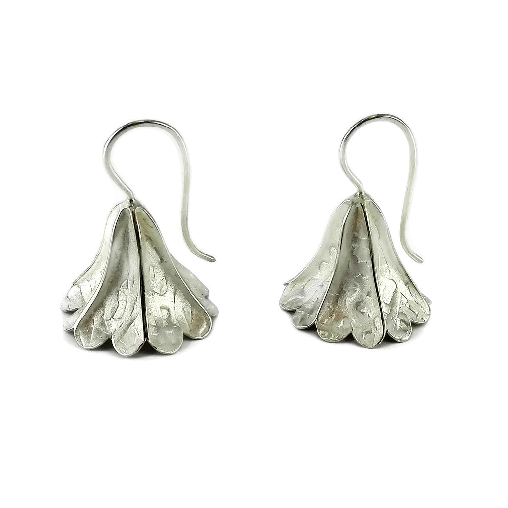 Silberne Ohrhänger in glockiger Blütenkelchform. Die Oberfläche ziert ein fein geprägtes organisches Muster mit einem hellen, matten Finish und Glanzkanten, welche einen wunderschönen Kontrast zur seidenmatten Oberfläche bilden. Sowohl für festliche Anlässe geeignet als auch für den Alltag.